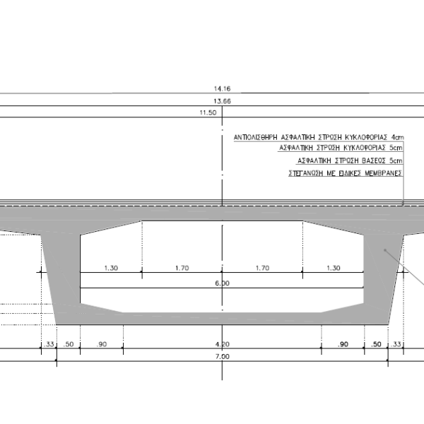 Όλες οι γέφυρες σχεδιάστηκαν με διατομή μονοκύψελου ή δικύψελου κιβωτίου (στις προσαρμογές των κλάδων με την αρτηρία) από οπλισμένο ή προεντεταμένο σκυρόδεμα. Οι συνεχείς κιβωτιοειδείς φορείς μελετήθηκαν σε φάσεις, ώστε να καταστεί δυνατή η κατασκευή τους. Επισημαίνεται ότι ο σχεδιασμός του Α/Κ παρουσίαζε ιδιαιτερότητες τόσο λόγω της ανάπτυξης του σε οικιστική περιοχή, όσο και λόγω υφιστάμενων εμποδίων (υφιστάμενες οδοί, ποταμός Γλαύκος, υφιστάμενη και μελλοντική σιδηροδρομική γραμμή υψηλών ταχυτήτων Σ.Γ.Υ.Τ.).